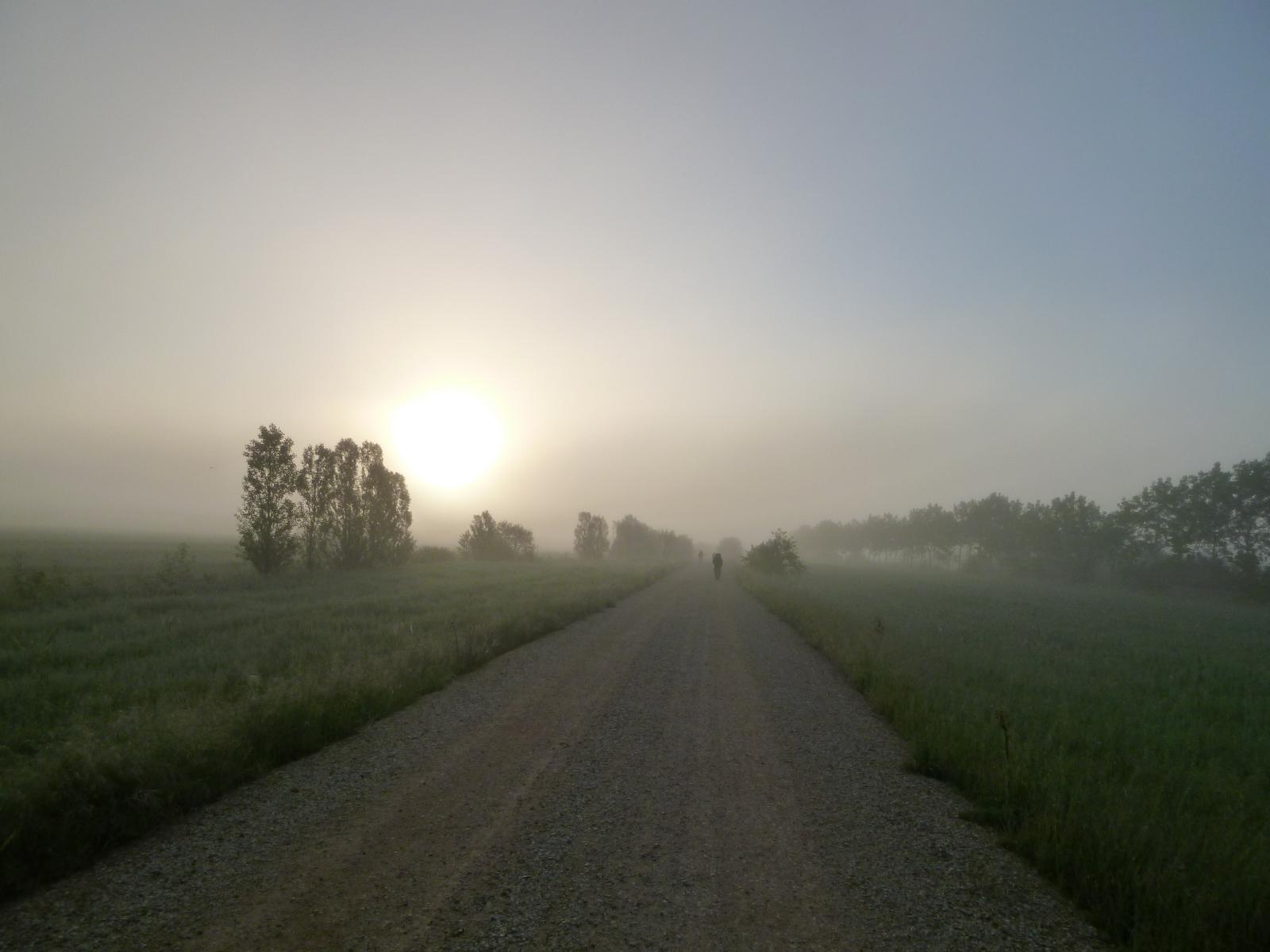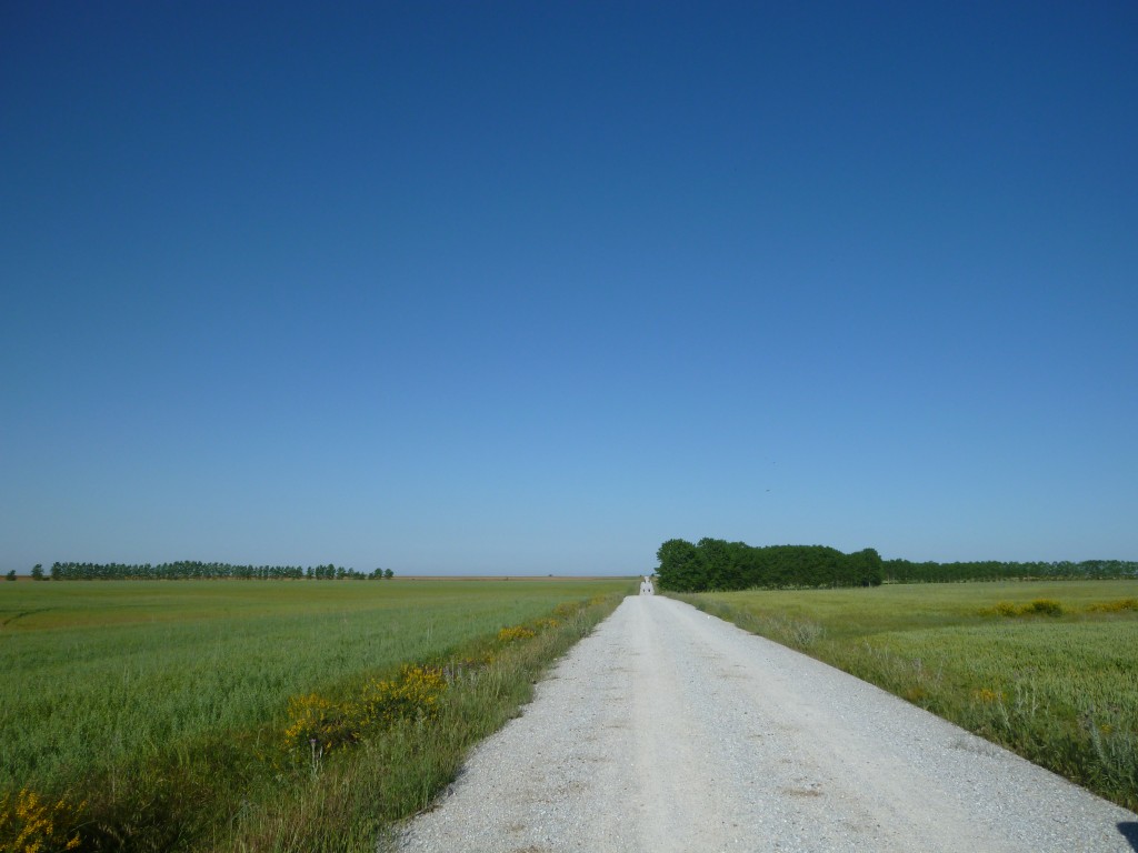 Einer der anspruchvollsten Strecken, da auf einem Weg von ca. 18 KM, der immer nur geradeaus geht, nur max. 1 Bar sein sollte und es aufgrund der Steppenartigen Landschaft (viele bebaute Felder) kaum Schatten gibt. Zum Glueck war es morgens relativ lange nebelig und daher angenehm zu gehen. Nach ungefaehr der Haelfte der Strecke war dann auch die „Bar“ in Sicht – eher eine „Not-Behelfs-Bar“, die auch noch relativ teuer war. Naja – da ich noch keinen Kaffe hatte, genemigte ich mir da einen und ein Tuetenkaffeestueckchen. Danach ging es weiter zum ersten Ort. Voller Heisslust auf „richtigen“ Kaffee stuermte ich die erste Bar und genehmigte mir dann gleich 2 und „Etwas“, was mit Tunfisch gefuellt war. Keine Ahnung, was es war – aber es sah ok aus und man konnte es essen. Dann noch schnell Schmerzmittel eingenommen und weiter im Schritt gehumpelt. Dabei sind dann auch Blasen entstanden, was durch die Sandalen, die ich in den letzten Tagen an hatte, sicher noch gefoerdert wurde. Nach 6,5 Stunden habe ich Terradillos de Templarios erreicht und dort dann 3 Blasen nach Pilgerart mit Nadel und Faden versorgt und den Fuss behandelt. Na wenigstens hatte ich keine Schulterschmerzen mehr.